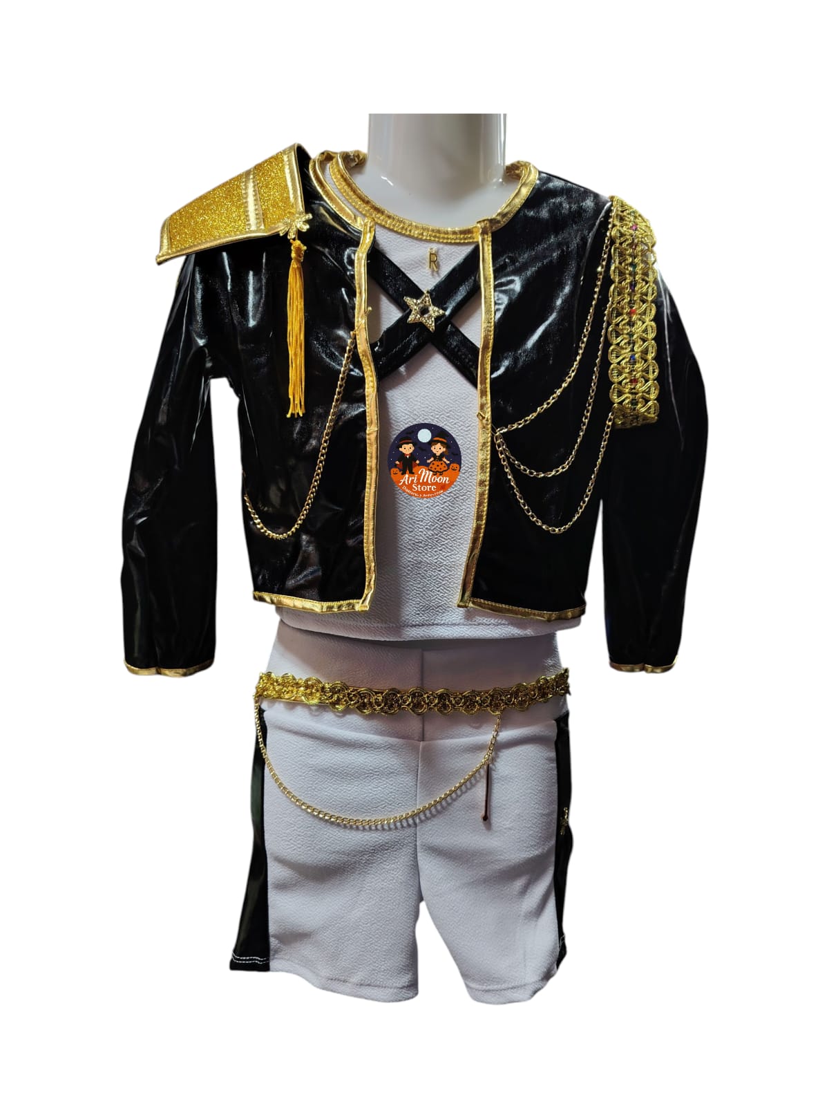 Confeccionado con materiales de alta calidad, este conjunto incluye short, polera, chaqueta y cinturón, con todos los detalles que hacen que brilles como una verdadera estrella del pop.