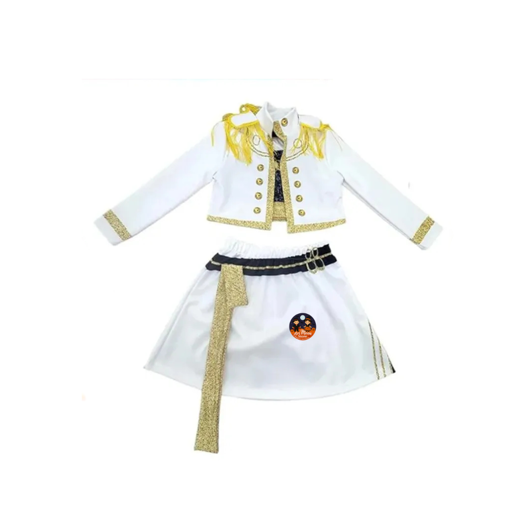 Incluye falda, polera y chaqueta con detalles y solapas decoradas.