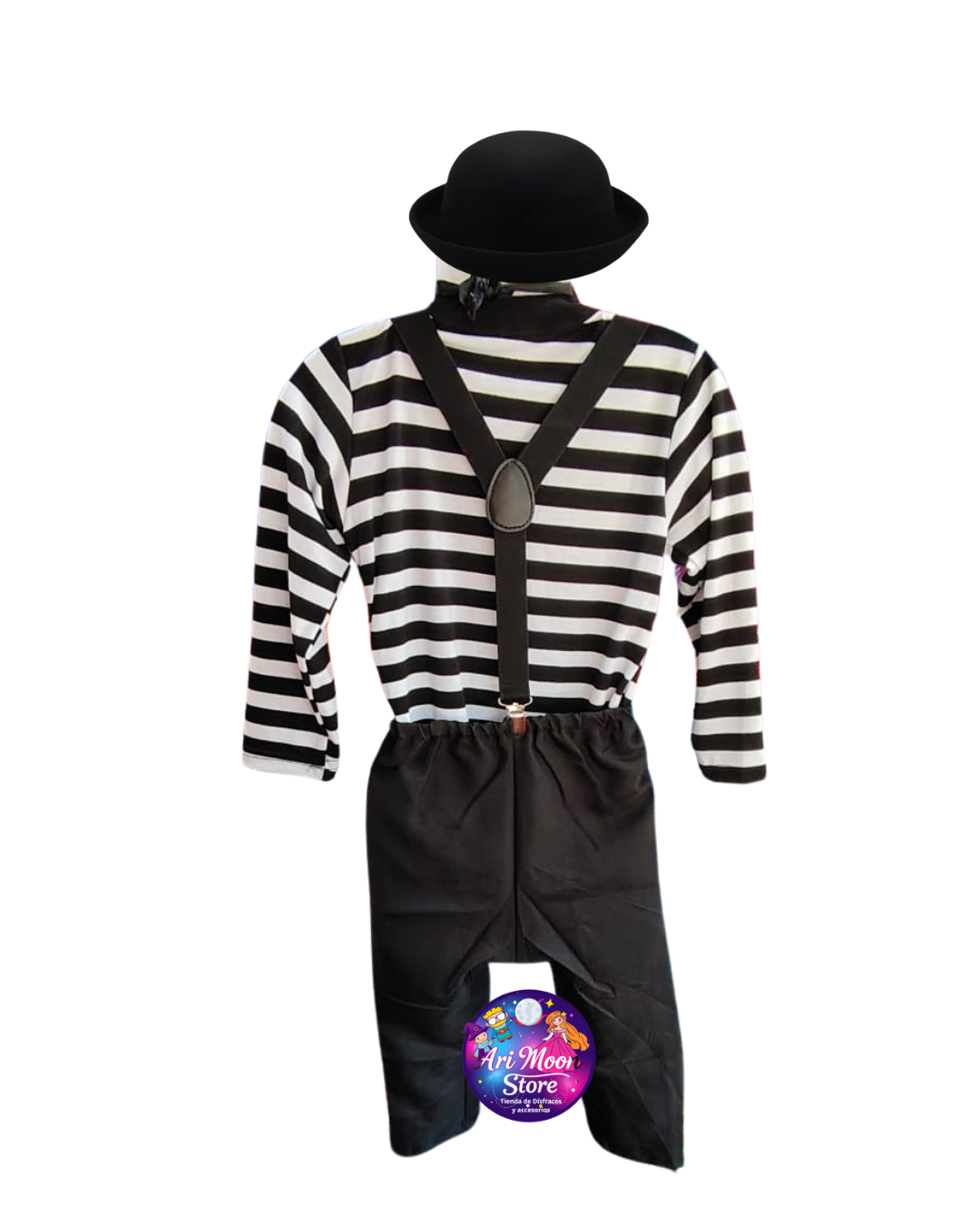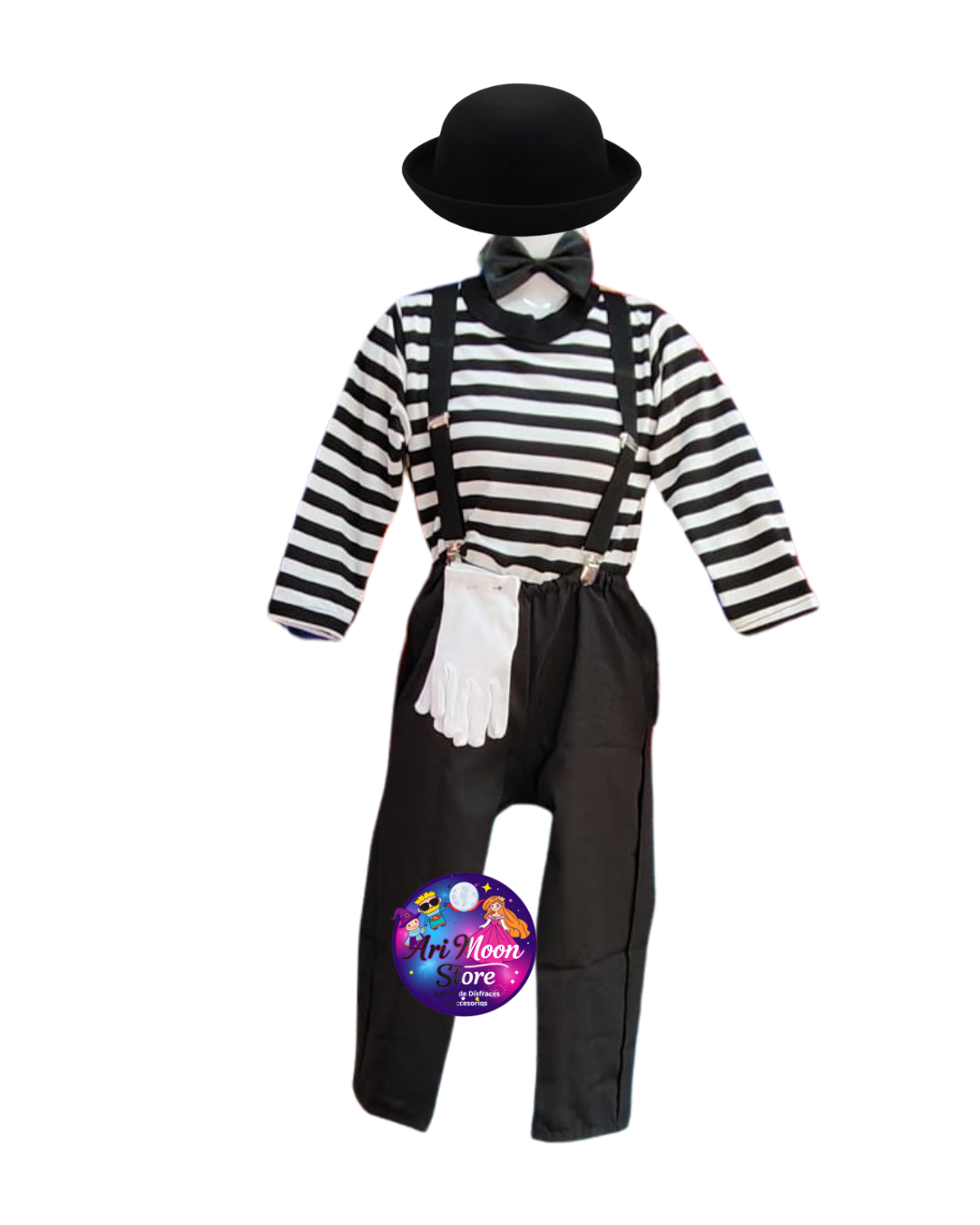disfraz mimo niño, disfraz mimo niña, disfraz mimo infantil completo, disfraz mimo con sombrero, disfraz mimo rayas blanco y negro, conjunto mimo escolar, disfraz mimo presentación colegio