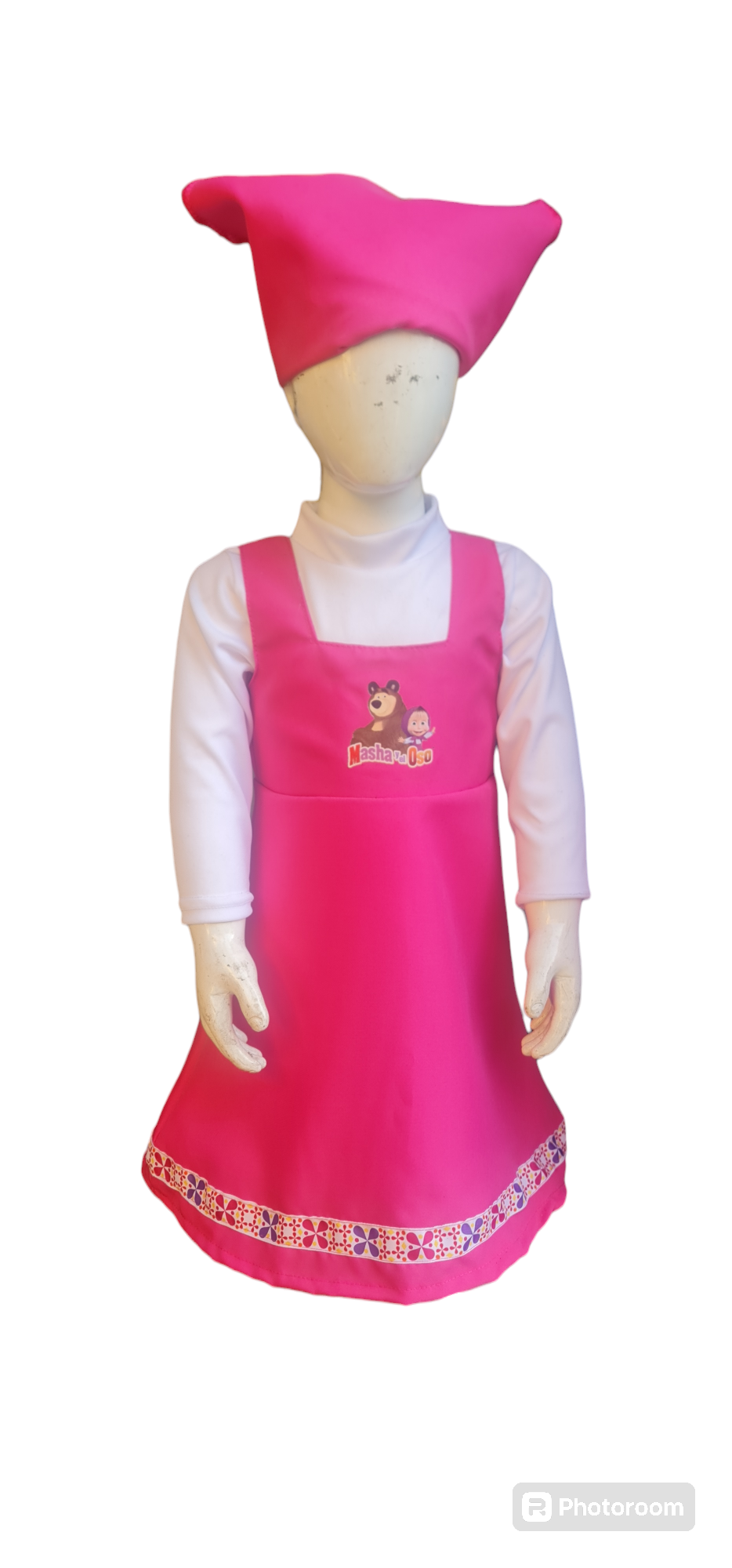 Este disfraz incluye un vestido largo color rosado, una polera blanca de manga larga y la clásica pañoleta para la cabeza, recreando fielmente el look de Masha en la popular serie animada Masha y el Oso 🎀👧.